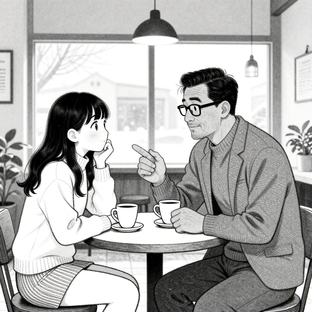 This black-and-white digital drawing depicts a middle-aged man with short dark hair and glasses, wearing a suit and sweater, seated at a round table with a young woman. She has long dark hair, wears a light sweater and skirt, and sits with her legs crossed. They are both holding cups of coffee and engaging in conversation; the man is pointing with his right index finger. The background features a window with soft light, potted plants, and a hanging lamp. The table is simple and wooden, with the characters positioned on the right side of the image. The style is reminiscent of manga or comic art, with clean lines and a slightly textured shading effect.