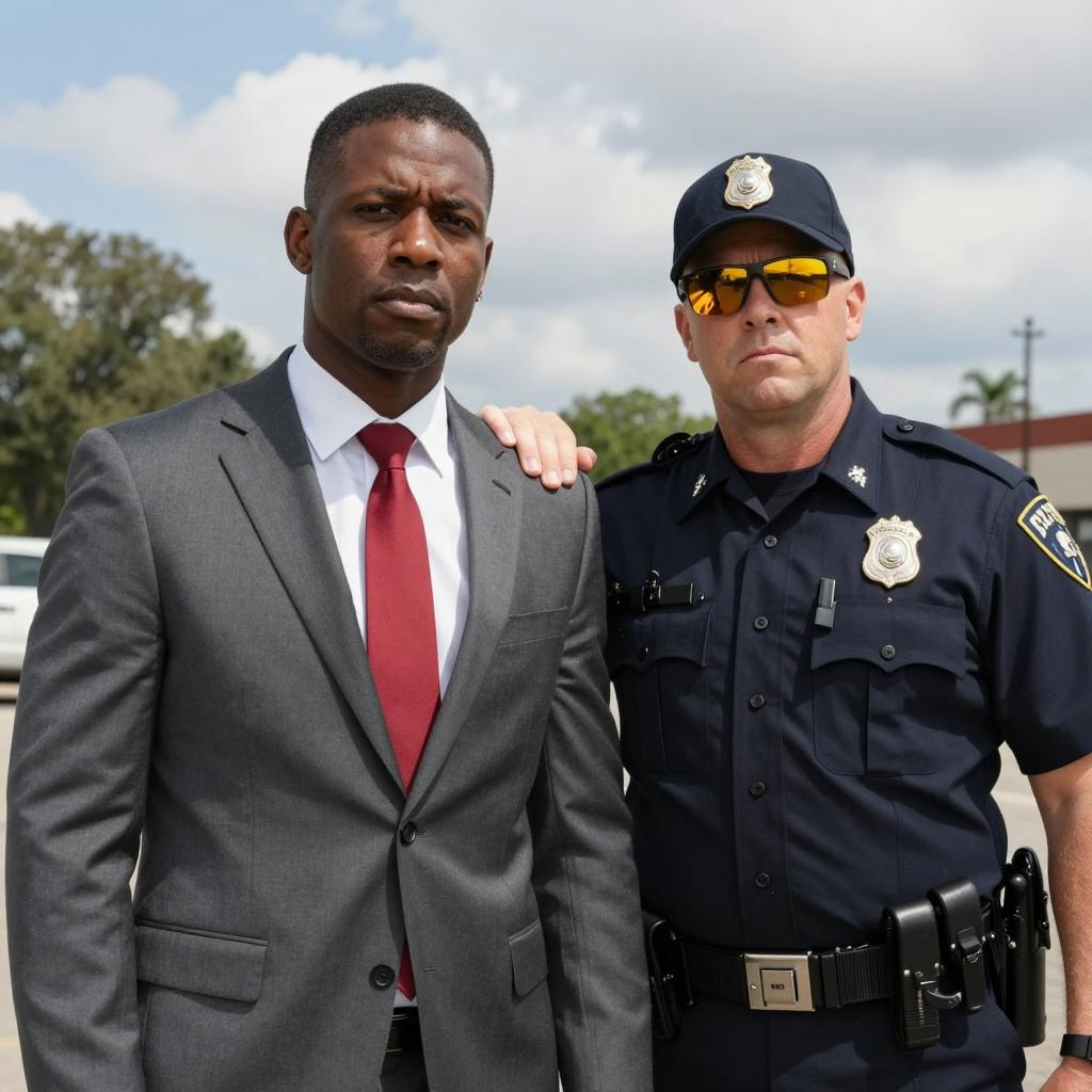 Photograph of two men in an office. White man with bald head, light blue shirt, left arm on wooden filing cabinet, looking at camera. Black man with cap, green polo shirt, seated, looking to the right. American flag on right, globe on left, framed documents on wall. White blinds partially open, green lamp on desk.