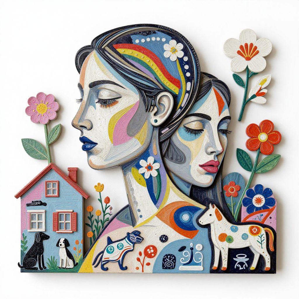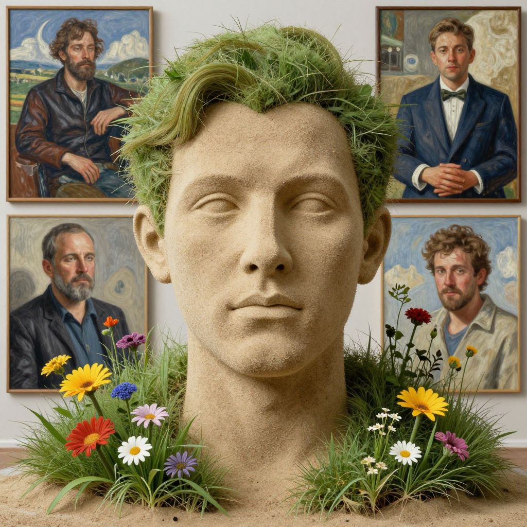 A photograph of a sculpted head, crafted from clay and covered in colorful, collage-like patterns and small objects. The face is divided into two halves, with the left side in blue and the right in beige. The face features a wavy, textured hairpiece, small plants, and various artistic elements like letters and figures. The background is a plain white wall. The base of the sculpture is covered in sand, adorned with vibrant flowers, including yellow, purple, and orange blossoms, and small rocks. The overall style is eclectic and mixed-media.