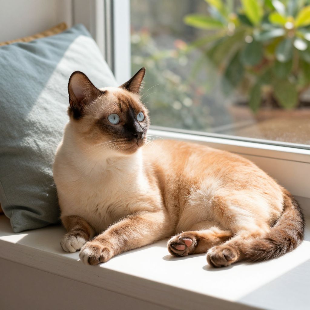 Photograph of a blue-eyed, cream and brown Siamese cat lounging on a sunlit windowsill, gazing outside with a cushion beside
