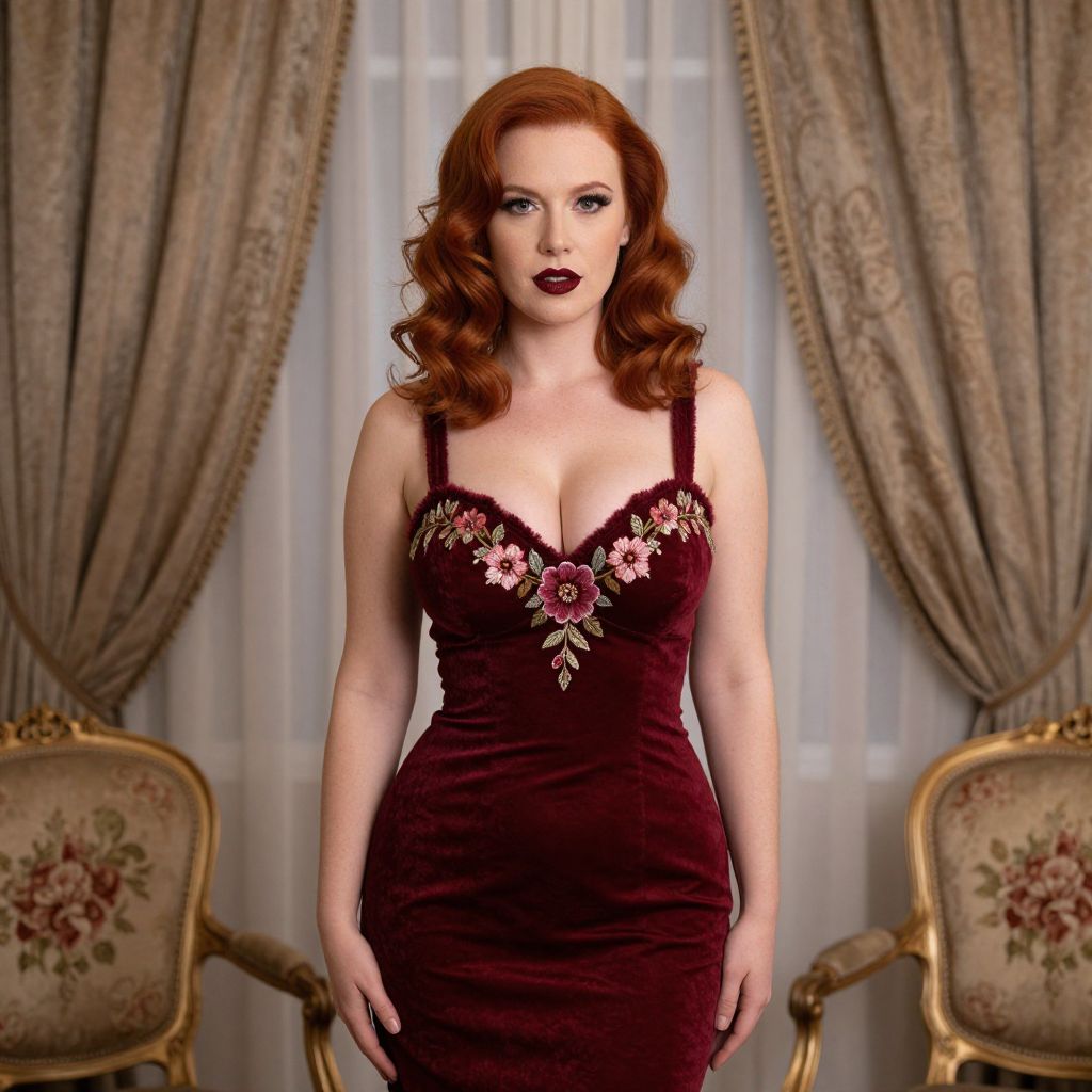 Photograph of a fair-skinned woman with wavy, shoulder-length red hair and dark red lipstick. She wears a form-fitting, deep burgundy dress with a plunging neckline adorned with intricate floral embroidery in pink, white, and green. The background features elegant, beige, patterned curtains framing a sheer white window. Two ornate, gold-framed chairs with floral upholstery are positioned on either side, symmetrically. The woman stands centrally, gazing directly at the camera with a confident expression. The overall setting suggests a vintage or classic style.