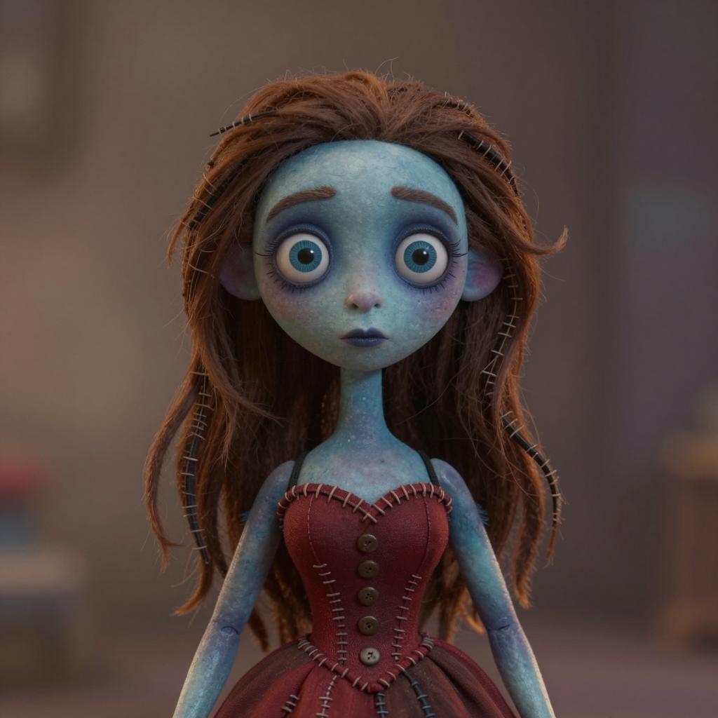 CGI scene of two animated characters. Male in black suit, pale skin, sharp features, turns head to look. Female with black bob, floral dress, striped leggings, smiles widely, leans on suitcase. Open window with diamond-patterned glass. Red curtains. Bookshelves in background.