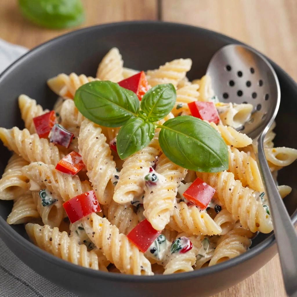 A close-up photo of a black bowl filled with creamy pasta salad. The pasta is mixed with diced red bell peppers and topped with fresh basil leaves. A metal slotted spoon is positioned to the right, slightly out of focus. The background is a wooden table, adding a rustic feel. The colors are vibrant, with the orange pasta, red peppers, and green basil standing out.
