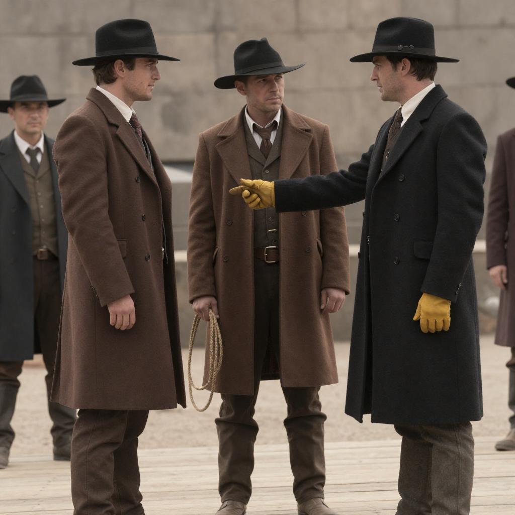 Two men in 1930s-style suits and hats in an office. One man on the left holds a pistol, standing near a desk with a typewriter, papers, and a phone. The other man on the right stands facing him, holding a glass. The background has framed pictures and a door with red curtains.