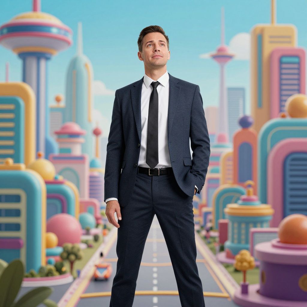 Photograph of a young, light-skinned man with short dark hair, standing confidently in the center of a vibrant, cartoonish cityscape. He is wearing a dark navy suit with a white shirt and black tie, his right hand in his pocket. The background features colorful, futuristic buildings with large domes and pastel colors, including pink, blue, yellow, and green. A road with yellow lines runs straight ahead, flanked by small trees and geometric shapes. The sky is bright blue, and the overall style is whimsical and playful. The man's expression is serious and determined.