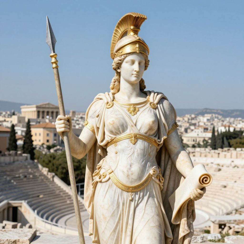 Detailed marble statue of Athena, Greek goddess of wisdom and war strategy, holding a scroll and spear. The statue features golden accents on the helmet and armor, set against the backdrop of ancient ruins and the cityscape of Athens, including a marble stadium and historic buildings.