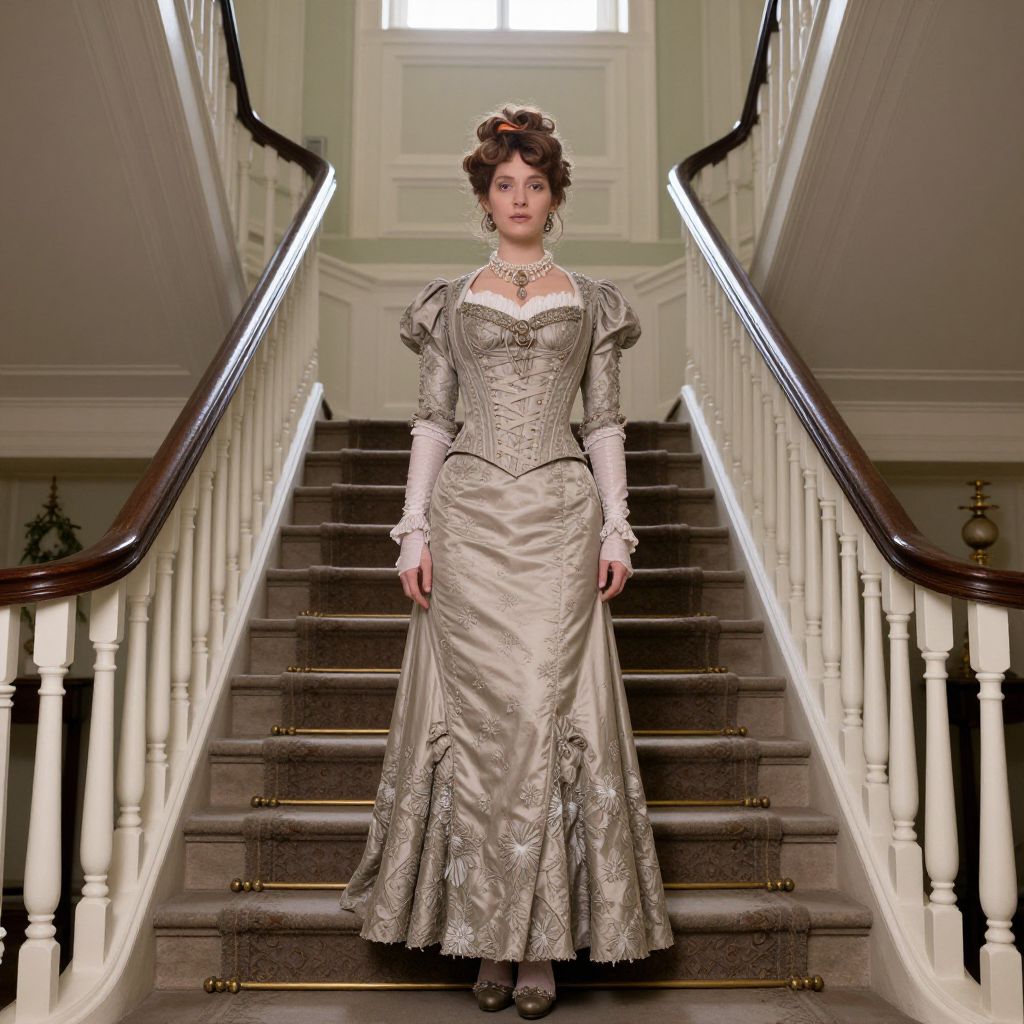 An expensively dressed Victorian woman standing at the top of a wide staircase in her house.