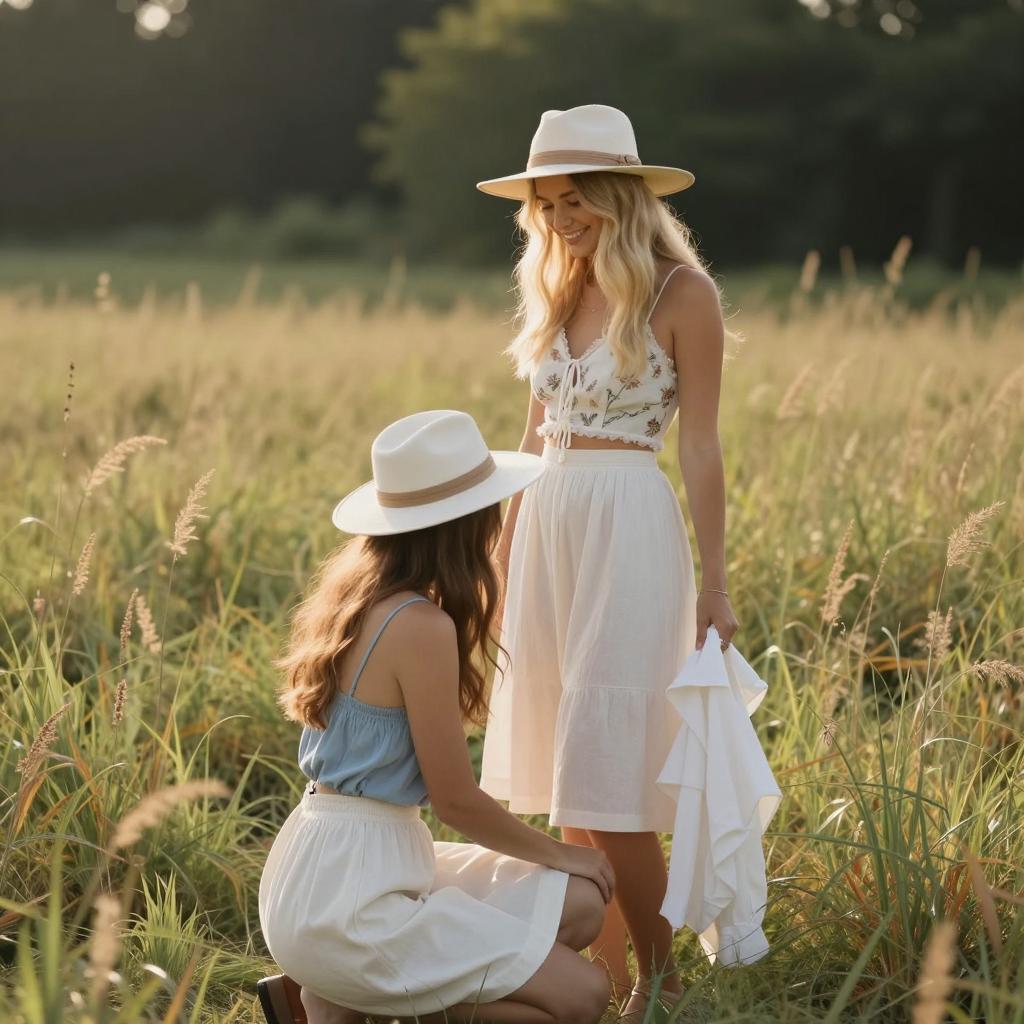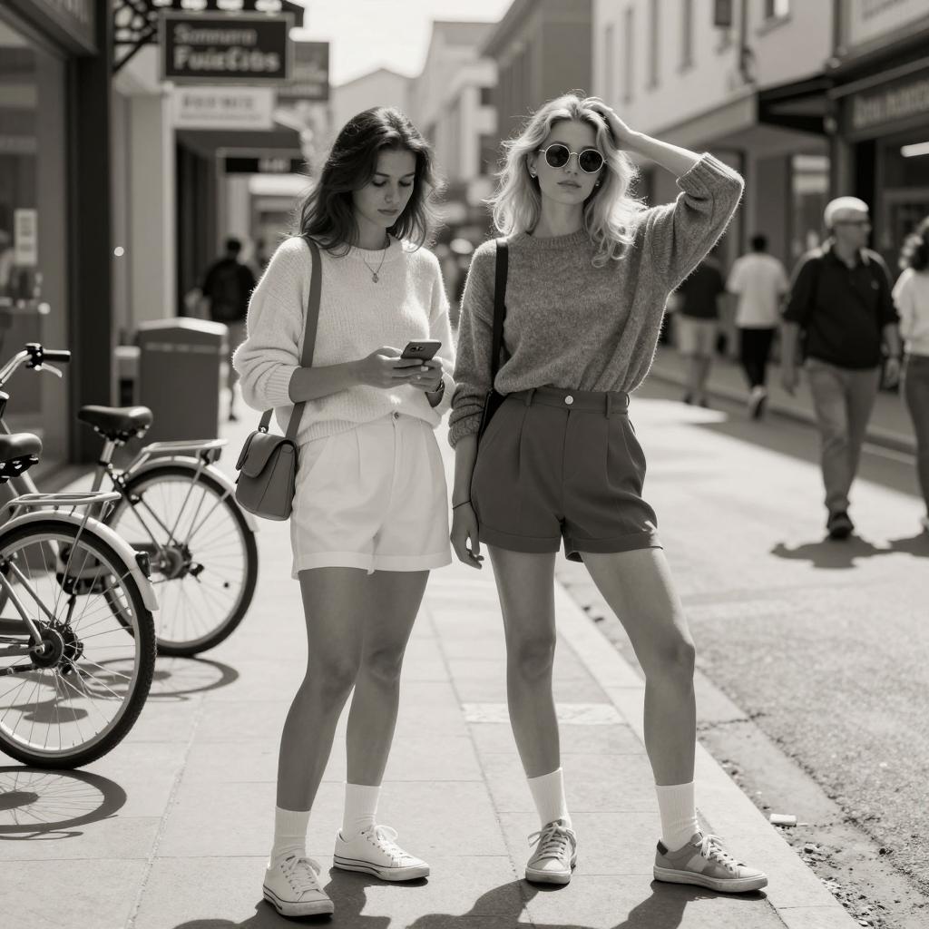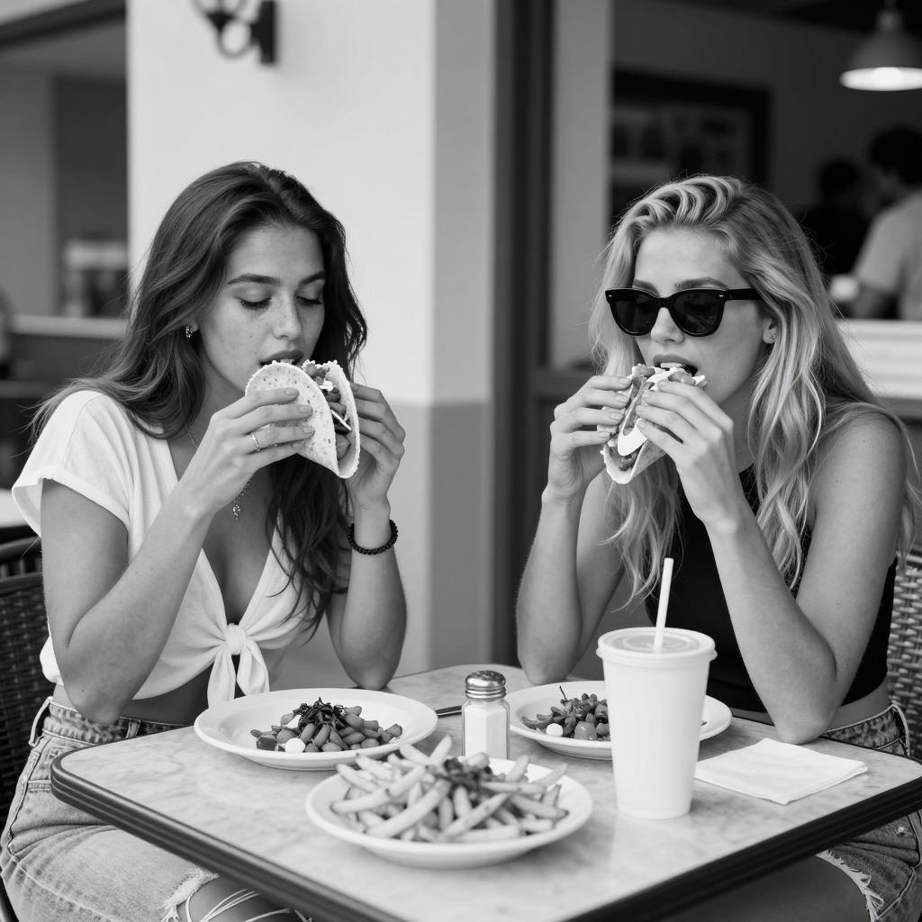 Two women sitting on a dock by a marina. Both wear white dresses and white sneakers. One holds a pastry, the other touches her hair. Open box with pastries between them. Boats and docks in background. Black-and-white photograph.