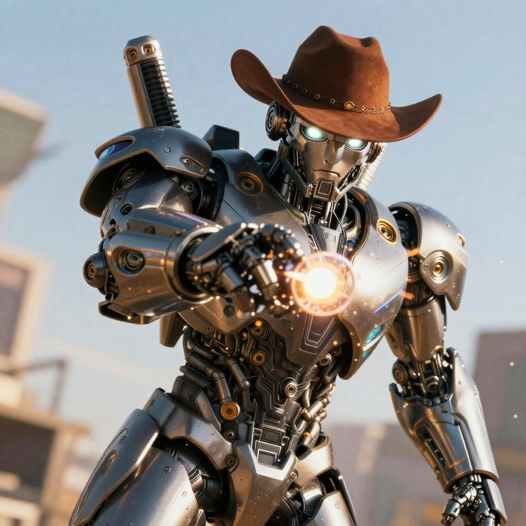 Cowboy shot of arcee, robot, glowing eyes, particles, 3d, realistic, cinematic