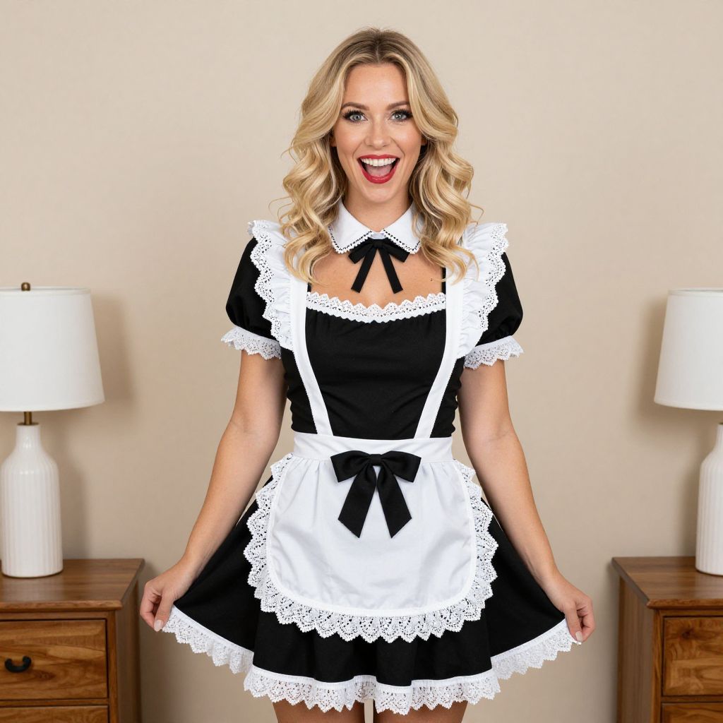 Photograph of a smiling blonde woman with wavy hair in a classic French maid outfit. The black dress features white lace trim on the sleeves, collar, and apron, with a black bow at the neck and waist. She stands in front of a beige wall, flanked by two wooden nightstands with white lamps. The woman's bright red lipstick contrasts with her fair skin, and her playful expression adds a cheerful vibe. The image is brightly lit, highlighting the textures of the lace and fabric.