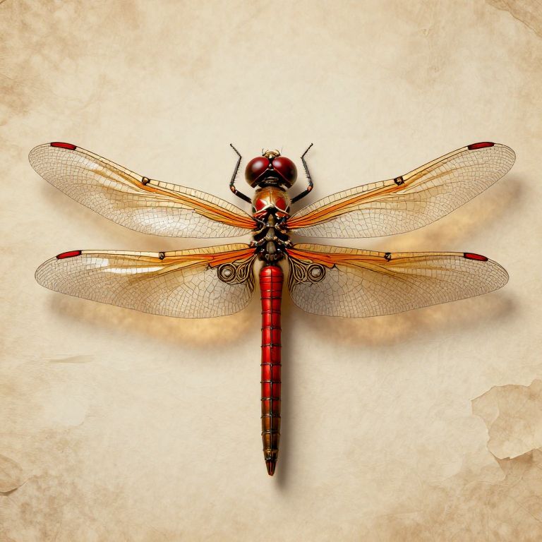 Photograph of a vividly detailed dragonfly with a striking red and black body, displayed against a textured, off-white background. The dragonfly's translucent wings are intricately veined with delicate, golden hues and red spots at the tips. Its large, round, black eyes are prominently featured at the top of its head. The body is segmented, with the thorax and abdomen displaying alternating red and black bands. The wings are splayed out symmetrically, creating a balanced and visually appealing composition. The background has a slightly worn, parchment-like texture, adding an antique feel to the image.