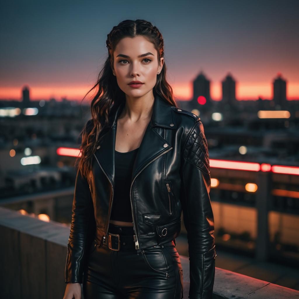 Medium shot fashion portrait of a stunning woman with messy pastel pink pixie cut with texture and bright red lipstick. She is wearing a white oversized linen suit with a silk camisole. She stands on a concrete rooftop terrace. The background features a silhouette of a city skyline against a warm orange gradient sunset sky. Soft golden hour lighting, cinematic atmosphere, photorealistic, 8k, sharp focus.