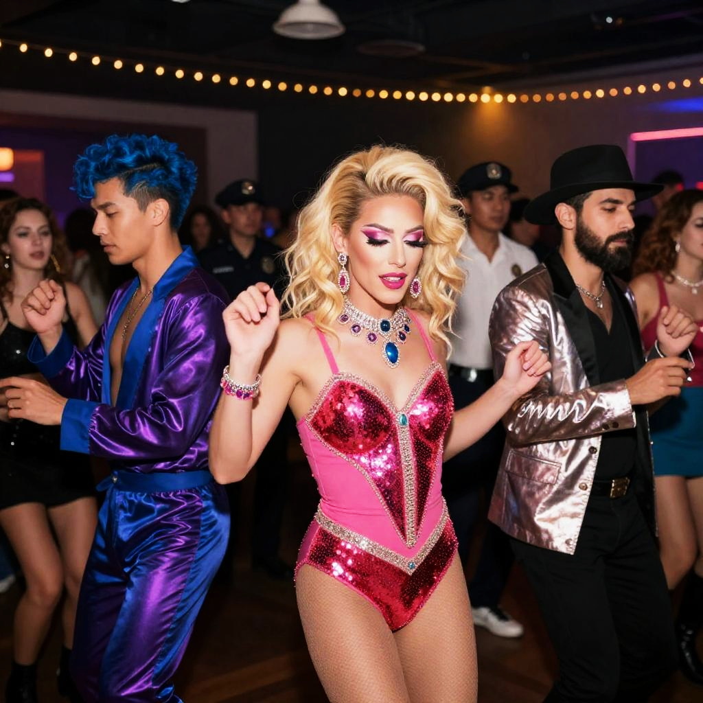 Photograph of a vibrant disco party. Three people in elaborate costumes lead the dance. Central figure, blonde with pink eyeshadow, wears pink and red sequin outfit, large jewelry. Man to the left, blue hair, shiny blue and purple robe. Man to the right, dark beard, metallic jacket, black hat. Background: string lights, police officers, other dancers. Dance floor, crowded, energetic atmosphere. Intense, joyful expressions.
