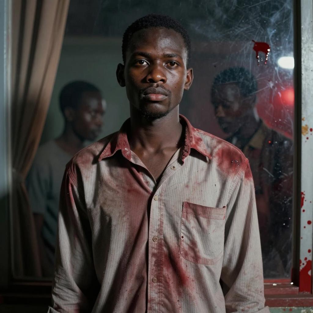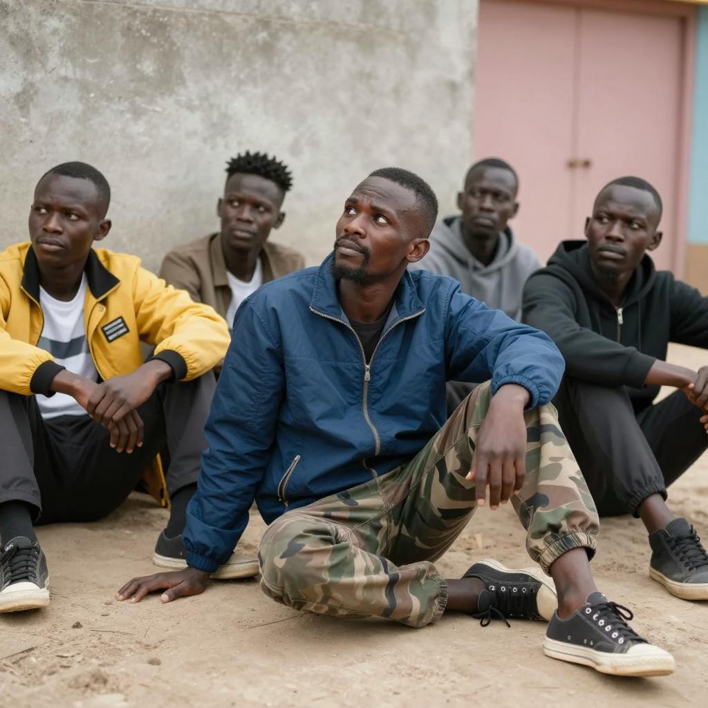 A group of five young dark-skinned men sitting on the ground outdoors against a concrete wall and a pink structure. The central man wears a blue jacket and camouflage pants, looking upward thoughtfully. The others wear casual clothing including a yellow jacket, and various hoodies, with focused and serious expressions. The scene has a natural, urban, and relaxed atmosphere.