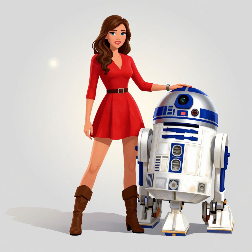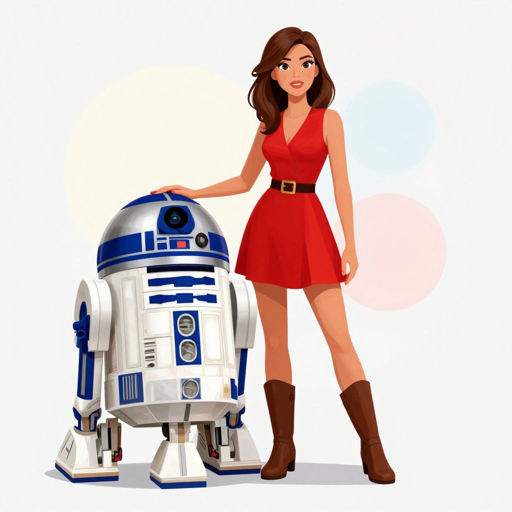 Digital illustration of a smiling brunette woman in a red dress and brown boots, standing beside a white and blue R2-D2 droid.