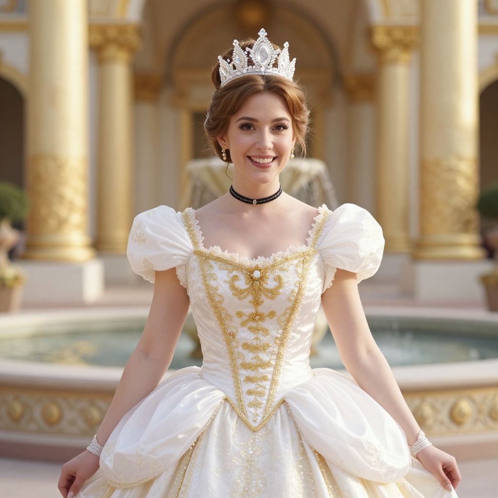Photograph of a young woman with fair skin and brown hair styled in an elegant updo, wearing a white, ornate, princess-style ballgown with puffed short sleeves and gold embroidery. She has a silver tiara on her head, a black choker necklace, and a silver bracelet on her right wrist. She stands in front of a grand, golden-columned backdrop with an ornate fountain in the background. She smiles brightly at the camera, exuding a fairy-tale princess charm. The lighting is bright, highlighting the details of her dress and the luxurious setting.