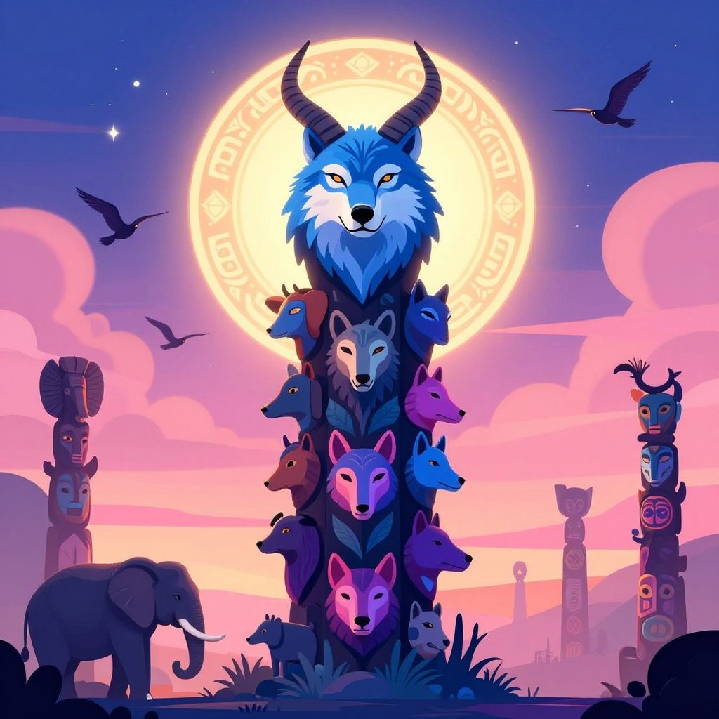 A vibrant digital illustration of a mystical totem pole featuring a large blue wolf head with horns at the top, surrounded by various animal faces in shades of blue, purple, and pink. The totem is illuminated by a glowing circular backdrop resembling a halo or sun symbol with intricate patterns. The scene includes additional totem poles, flying birds, an elephant and calf on the left, and a surreal sunset sky with pink clouds and celestial bodies, creating a fantasy landscape with a magical atmosphere.