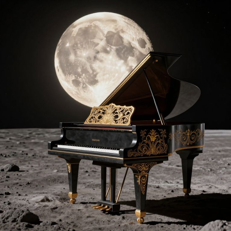A grand piano with ornate detailing and gold accents stands gracefully on a desolate lunar landscape, its lid open against the backdrop of a massive, cratered moon glowing softly in the starlit sky.