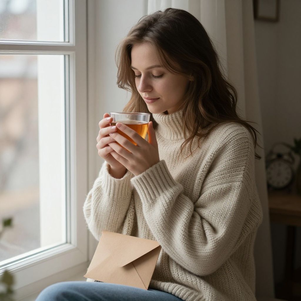 Enveloped in the warmth of hand-knit comfort, a woman sits by the window, cradling a cup of tea—a moment suspended in serenity, where the soft hum of life outside blends with the quiet whispers of contentment within.