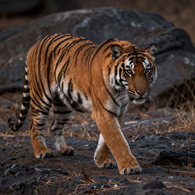 Tiger stalking prey on rocky terrain, muscles rippling under striped coat, alert eyes fixed ahead, rugged landscape background, dusk lighting with warm tones, cinematic wildlife portrait