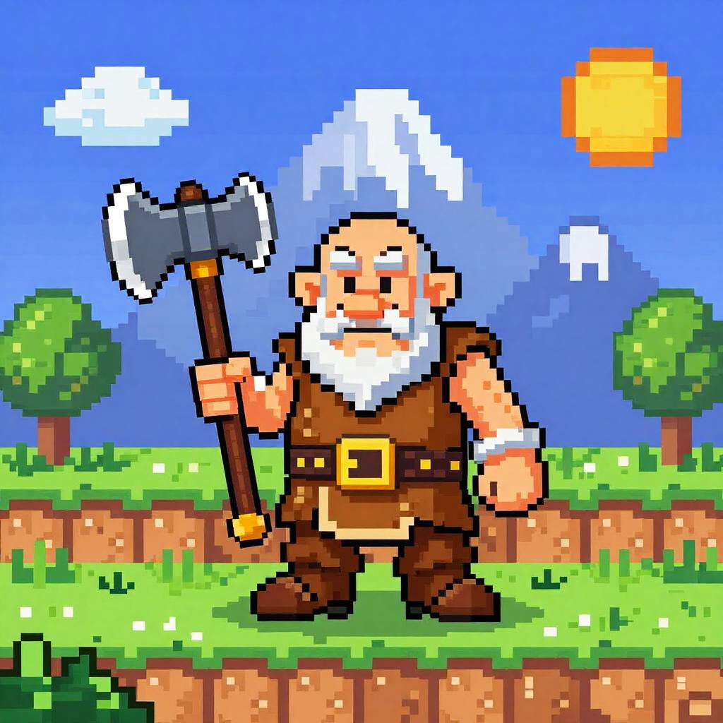 An extreme long shot showcasing a vibrant 8-bit landscape. The central figure is a grizzled dwarf with a large battle axe, embodying a mountain defender. This pixelated masterpiece captures the essence of retro video games, influenced by the styles of Mike Mignola and Yoshitaka Amano.
