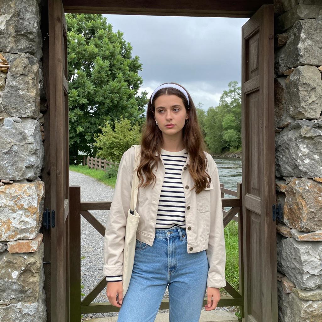 Young woman with long brown hair, white headband, wearing a striped shirt, beige jacket, and light blue jeans. She carries a beige bag over her right shoulder. Standing in a stone doorway, looking ahead with a neutral expression. Background: green trees, wooden gate, gravel path, and a river. Overcast lighting. Realistic photograph.