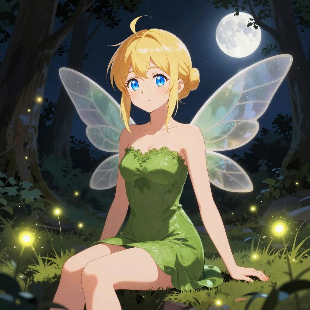A vibrant digital anime-style drawing of a cute fairy girl with long, flowing blonde hair and big blue eyes. She's wearing a tight, green strapless dress that highlights her curvy figure and small breasts. Her translucent blue wings glow in the moonlit forest background. She's sitting on a dark rock, smiling shyly, with a full moon shining behind her.