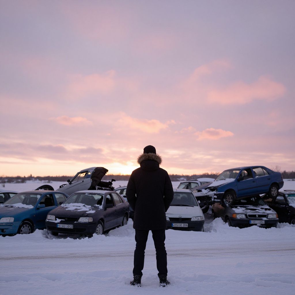 A man stands in the snow, observing a pile of broken cars under a pink cloudy sunset.
