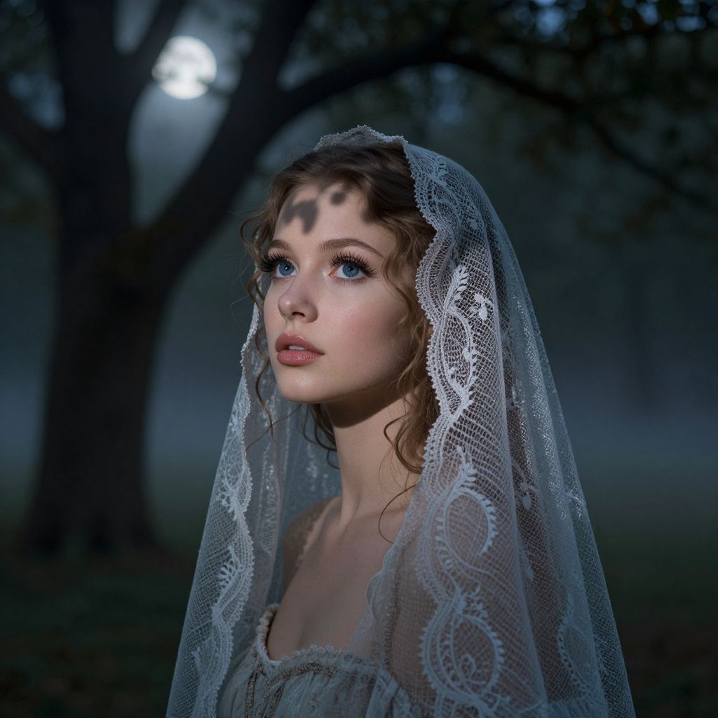 An enchanting portrait of a young Slavic woman with captivating blue eyes accentuated by long lashes, her delicate features adorned with a sheer lace veil cascading down her shoulders like silk threads. The subtle shimmer of the veil under soft moonlight filtering through an ancient tree's canopy casts dappled shadows on her porcelain skin and highlights the curve of her full lips. Standing at the edge of a misty forest clearing, she peers into the unknown with a blend of curiosity and apprehension, her gaze exuding an ethereal essence unique to the night. The composition frames her in a three-quarter view, with the lush forest background gradually fading from focus, creating an emotional gradient that seamlessly blends tranquility and intrigue.