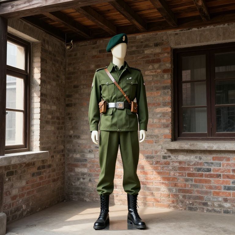 A mannequin wearing a detailed green military uniform with a green beret, black leather shoes, and a polished steel belt stands tall in front of a weathered brick building featuring a wooden ceiling with exposed beams and wooden planks. The building has a rustic, vintage appearance, with sunlight streaming through a nearby window, casting soft shadows. The mannequin is facing forward with a slightly tilted posture, capturing a sense of quiet dignity and historical atmosphere. The scene is set in a nostalgic, mid-20th century urban environment, blending military aesthetics with vintage architecture.