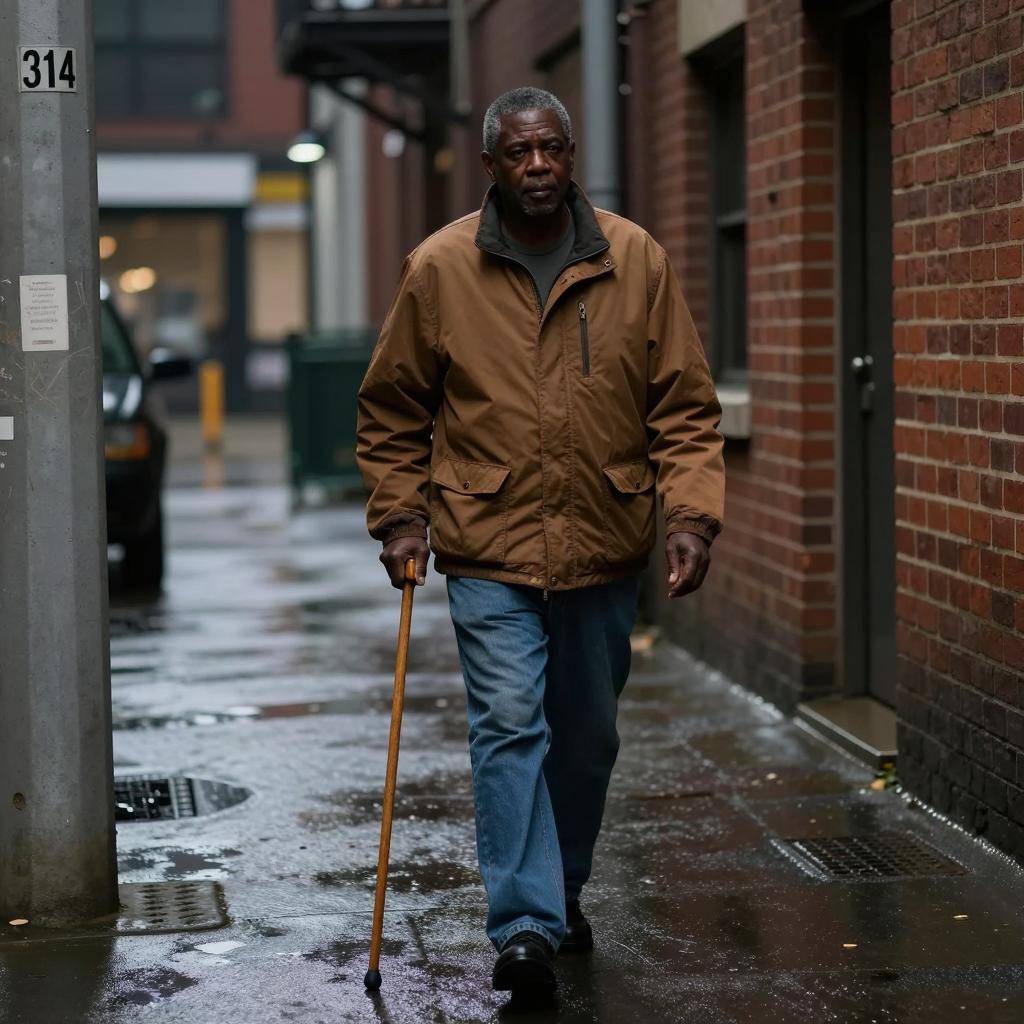 A middle-aged Black man with short hair walks down a dimly lit, wet urban alley at night. He wears a brown jacket, blue jeans, and black shoes, holding a cane in his right hand. The alley has dark, wet pavement, red brick walls on the right, and a concrete pillar with a visible number "314" on the left. The background is blurry, with indistinct shapes and shadows.