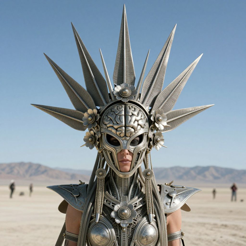 The image showcases a striking headdress that would undoubtedly impress at Burning Man, crafted by an alien genius. The headdress is a complex assembly of metallic components, featuring a central, intricate structure that resembles a mechanical brain or a futuristic helmet. The main body of the headdress is adorned with large, pointed extensions that resemble the spines of a mythical creature, adding a sense of grandeur and otherworldliness. These extensions are meticulously detailed, with a mix of smooth and textured surfaces, giving the headdress a dynamic and tactile appearance. The central structure is flanked by smaller, flower-like elements, each meticulously crafted with precision and elegance. The headdress is worn by a figure whose face is partially obscured by the intricate design, adding an air of mystery and intrigue. The background reveals a vast, open desert landscape, with distant figures and mountains, creating a sense of scale and emphasizing the grandeur of the headdress. The overall composition is balanced, with the headdress being the focal point, drawing the viewer's attention with its intricate details and futuristic design.
