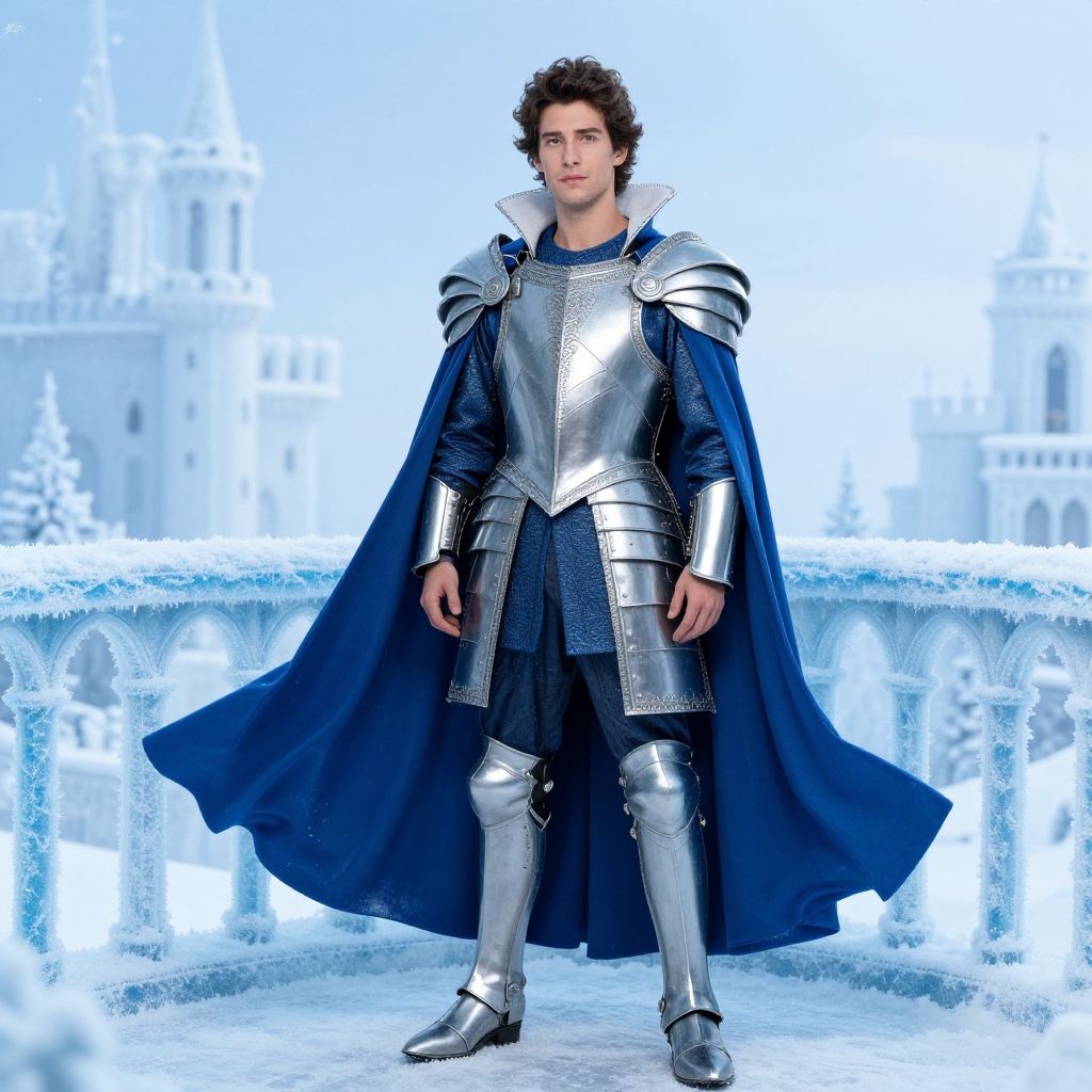 Photograph of a young, Caucasian man with curly brown hair, standing confidently on a frosty, castle-like balcony. He wears shiny silver armor with intricate designs, including a chest plate, shoulder guards, and knee guards, paired with a flowing, dark blue cape that billows behind him. His expression is serious, and he stands with legs slightly apart and hands relaxed by his sides. The background is a blurred, icy castle with white, frost-covered architecture, enhancing the wintry, medieval atmosphere. The overall color palette is cool, dominated by blues and silvers.