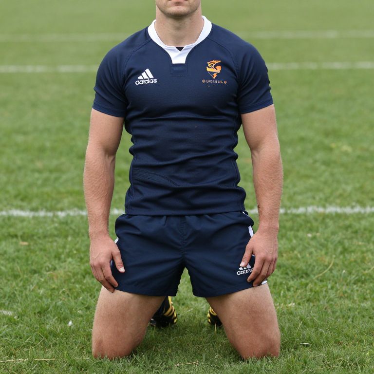 Rugby Clothing, rugby player kneeling on the ground with his hands on his knees