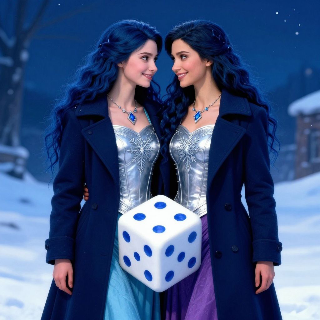 This digital CGI image portrays two identical women with long, wavy dark blue hair, standing in a snowy, nighttime forest. They wear silver, beaded, low-necked dresses with black coats and blue gemstone necklaces. Each holds a large, white dice with blue spots. The women are smiling and facing each other, their faces close together. The background is a dark, wintry forest with snow-covered ground and blurred trees. The overall color palette includes dark blues, whites, and silvers, creating a magical, icy atmosphere. The women's similar features and identical outfits suggest a twin or mirrored theme.