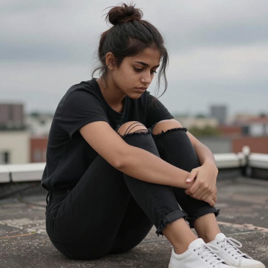 Photograph of a young woman with dark hair in a bun, wearing a black t-shirt and ripped jeans, sitting on a rooftop, looking down,
