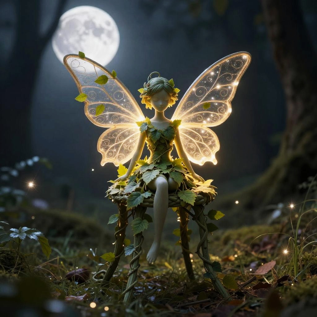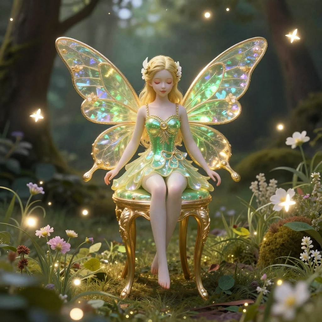 Tinkerbell chair, whimsical fairy-themed armchair glowing with soft green and gold lights, surrounded by sparkling pixie dust in an enchanted forest setting, ultra detailed
