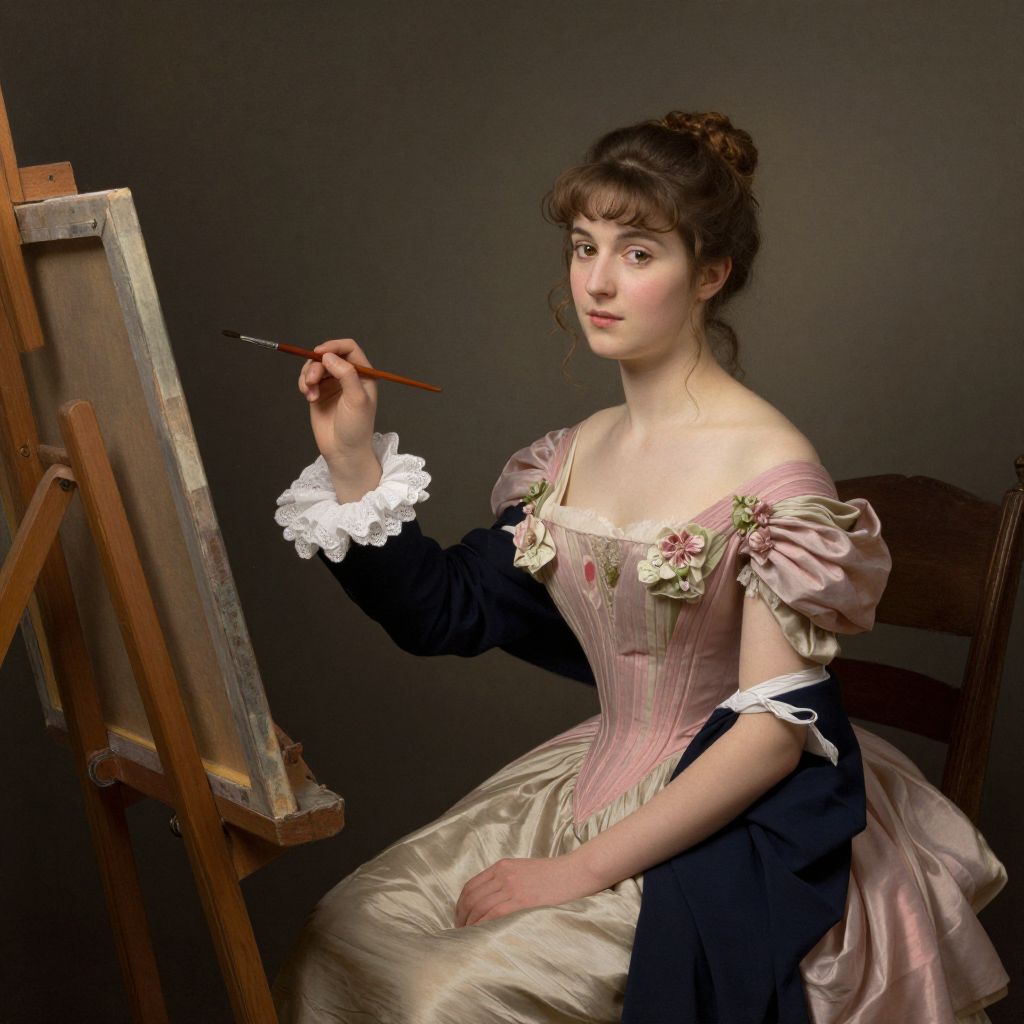 In a richly detailed digital art rendering, a portrait painter dressed in a classic navy suit with intricate white ruffled cuffs holds a paintbrush, capturing the essence of a young woman adorned in an elegant pink-and-beige gown with floral accents, as she sits poised before a wooden easel, evoking a timeless, vintage aesthetic reminiscent of forgotten eras.