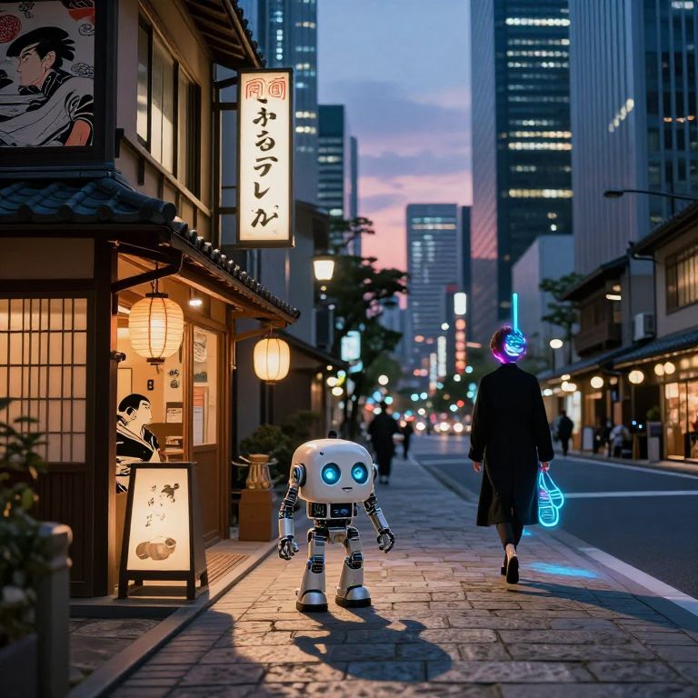 A photograph of a futuristic, twilight city street in Japan. A small, white, robotic character with large blue eyes and metallic limbs walks on the cobblestone sidewalk, illuminated by warm streetlights. To the left, a traditional Japanese building with illuminated signs featuring Japanese characters and a manga-style drawing. A person in a black coat and neon blue hood walks away from the camera on the right. Tall, modern skyscrapers with lit windows loom in the background. The sky is a gradient of pink and blue, suggesting dusk. The scene blends traditional and futuristic elements, creating a unique urban atmosphere.