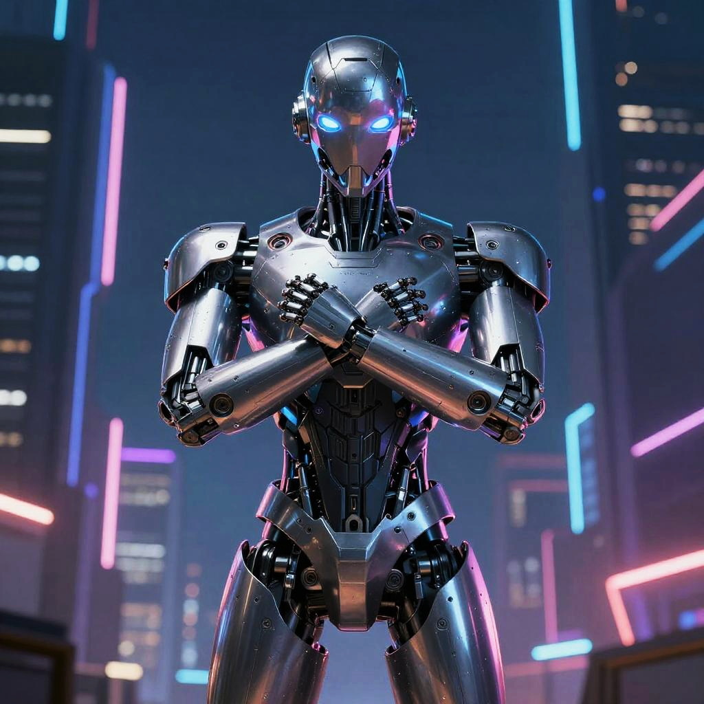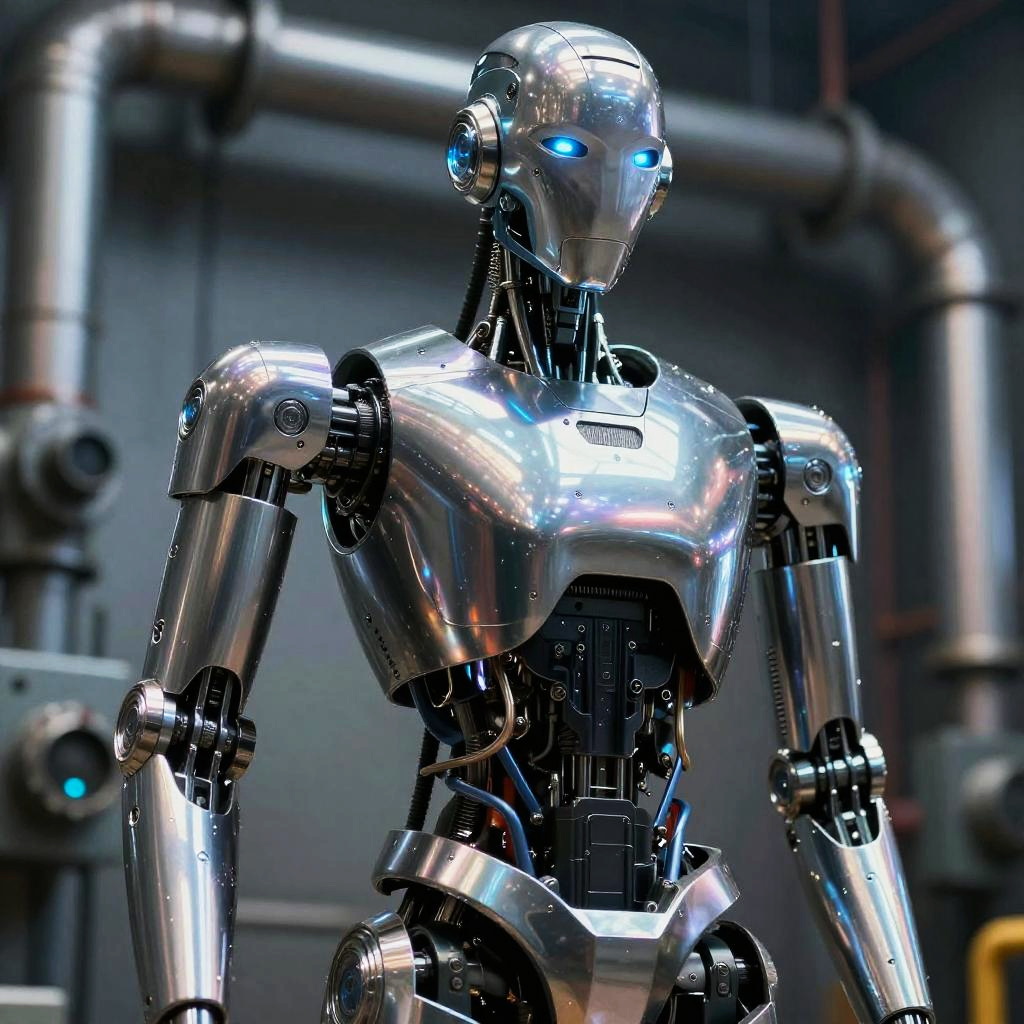 A highly detailed chrome chest plate of a robotic exoskeleton featuring biomechanical design with smooth curves and angular elements, illuminated by soft LED lights. The robotic torso and arms are displayed on a sci-fi laboratory pedestal within a modern, high-tech lab environment.