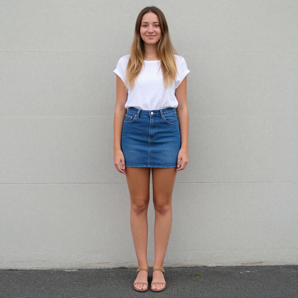 Photograph of a young woman with long, light brown hair, wearing a white t-shirt, high-waisted blue denim skirt, and pink sandals