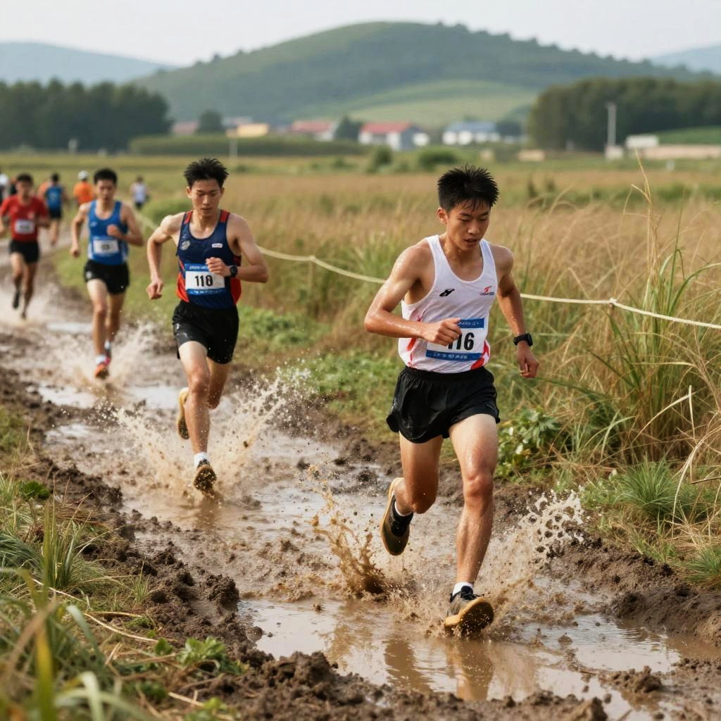 Crosslauf event in an open field with muddy paths, runners splashing through puddles, surrounded by tall grass and distant hills, focus on movement and energy, vibrant colors highlighting sweat and effort, cinematic style with depth of field blur.