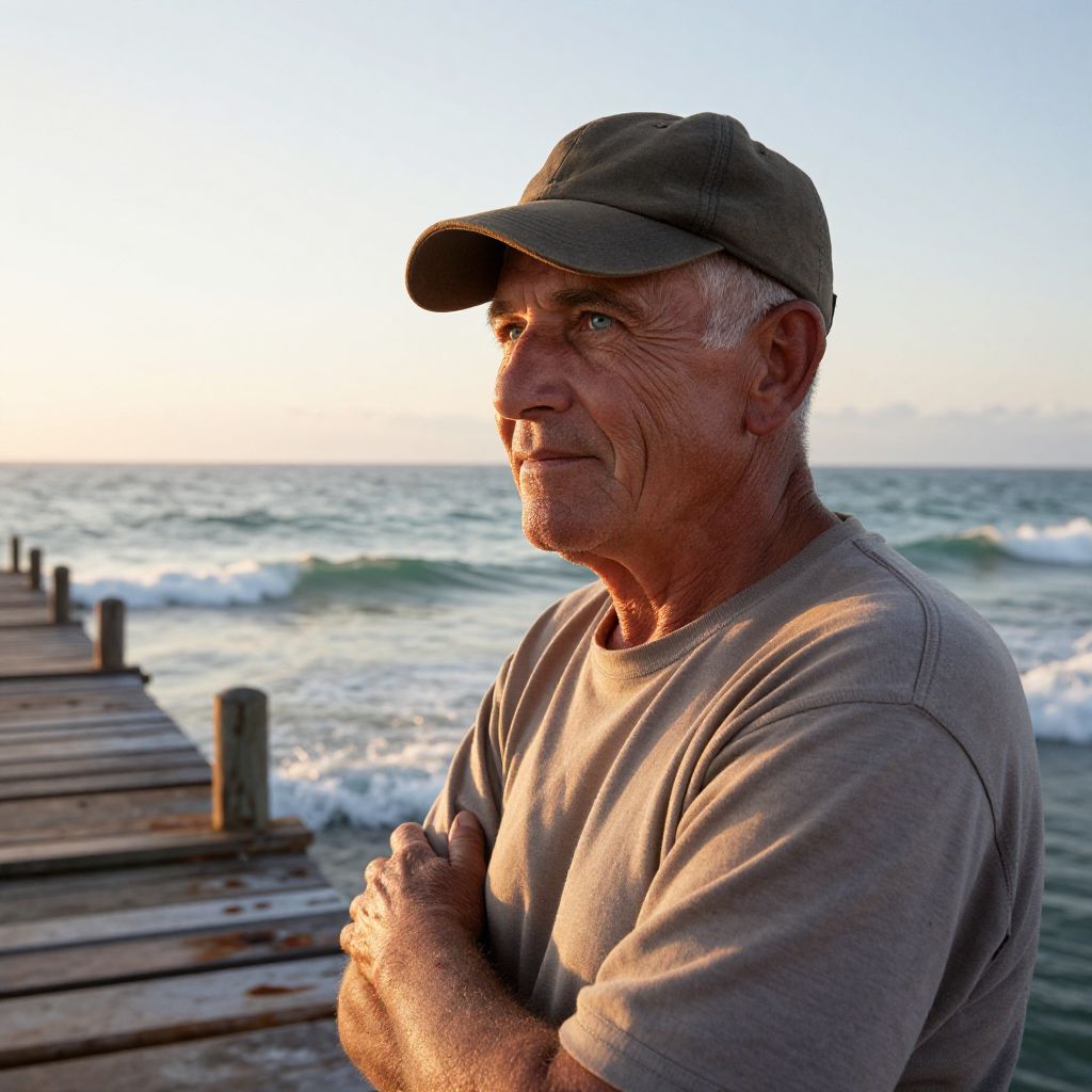 Photograph of an elderly man with graying hair, wearing a gray t-shirt and cap, standing on a wooden pier at sunset, ocean waves in