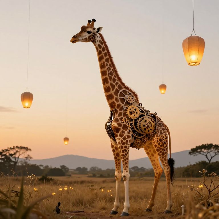 Clockwork giraffe strides gracefully through a serene savanna, its body adorned with intricate golden gears and cogs, while a trail of shimmering bubbles floats upward against a soft, honey-hued sky.