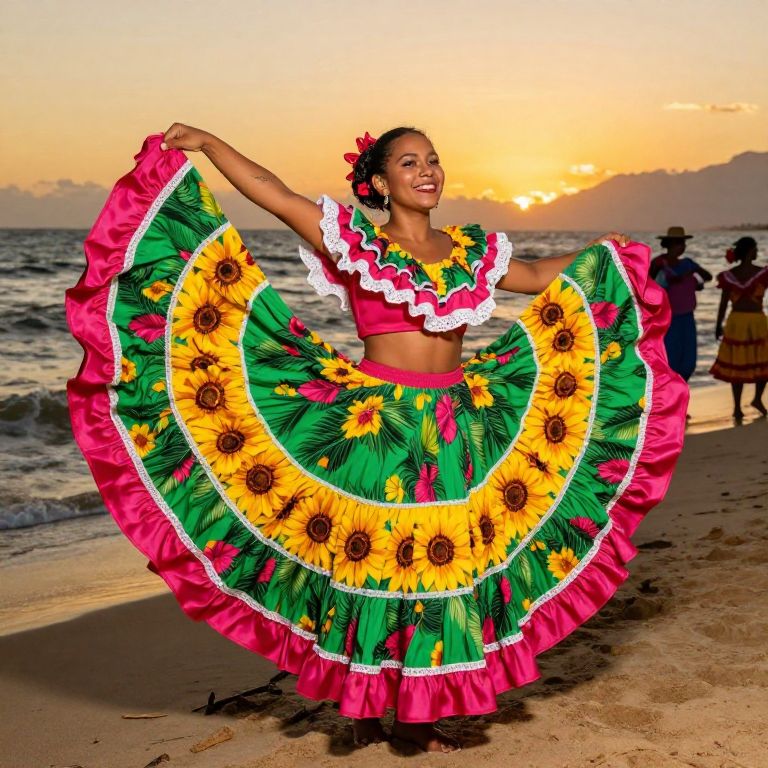 A graceful Colombian cumbia dancer with soft brown skin, full lips, and a warm, smiling face, wearing a vibrant flowing skirt in tropical colors like magenta, green, and sunflower yellow, dancing on a sandy beach during a lively local celebration, with waves gently lapping against the shore and the horizon painted in golden hues.