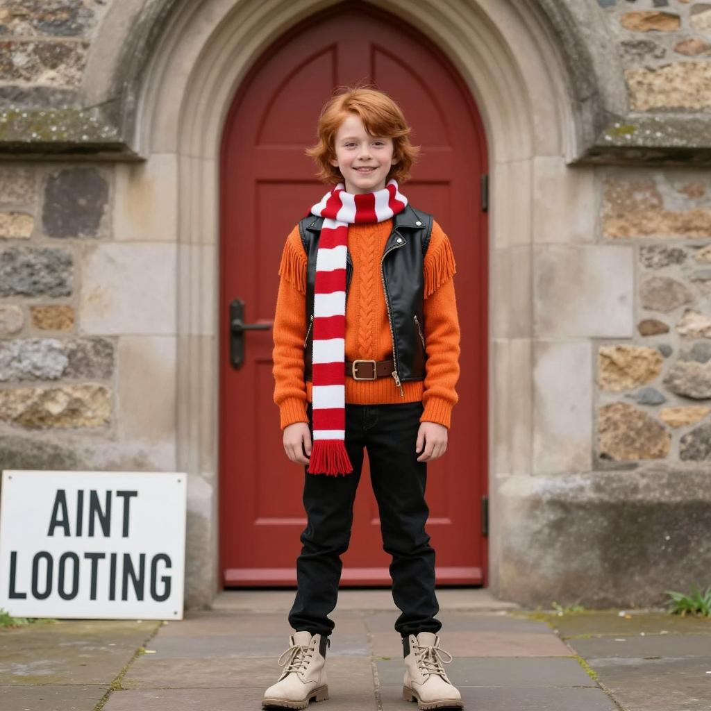 Andy little britain costume, photograph of a young boy standing in front of a stone archway with a red door, wearing an orange sweater with fringe, black leather vest, red and white striped scarf, brown belt, black pants, and beige lace-up boots, "AINT LOOTING" sign to the left, casual outdoor setting, daytime, neutral stone background, full-body portrait, slightly smiling, medium-length red hair, realistic style