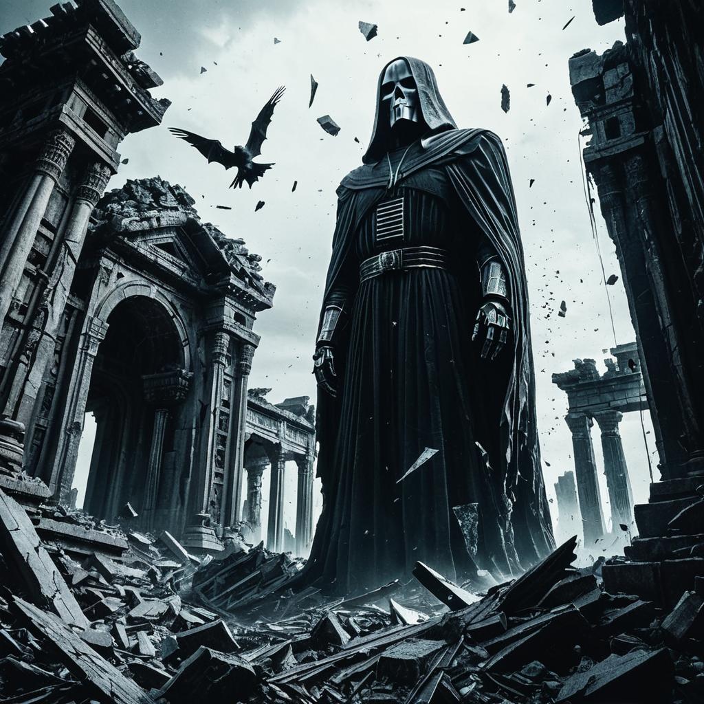 A massive winged demon, with flaming horns and charred skeletal wings, towering over a desolate volcanic wasteland, rendered in the dramatic and apocalyptic style of Hideaki Anno.