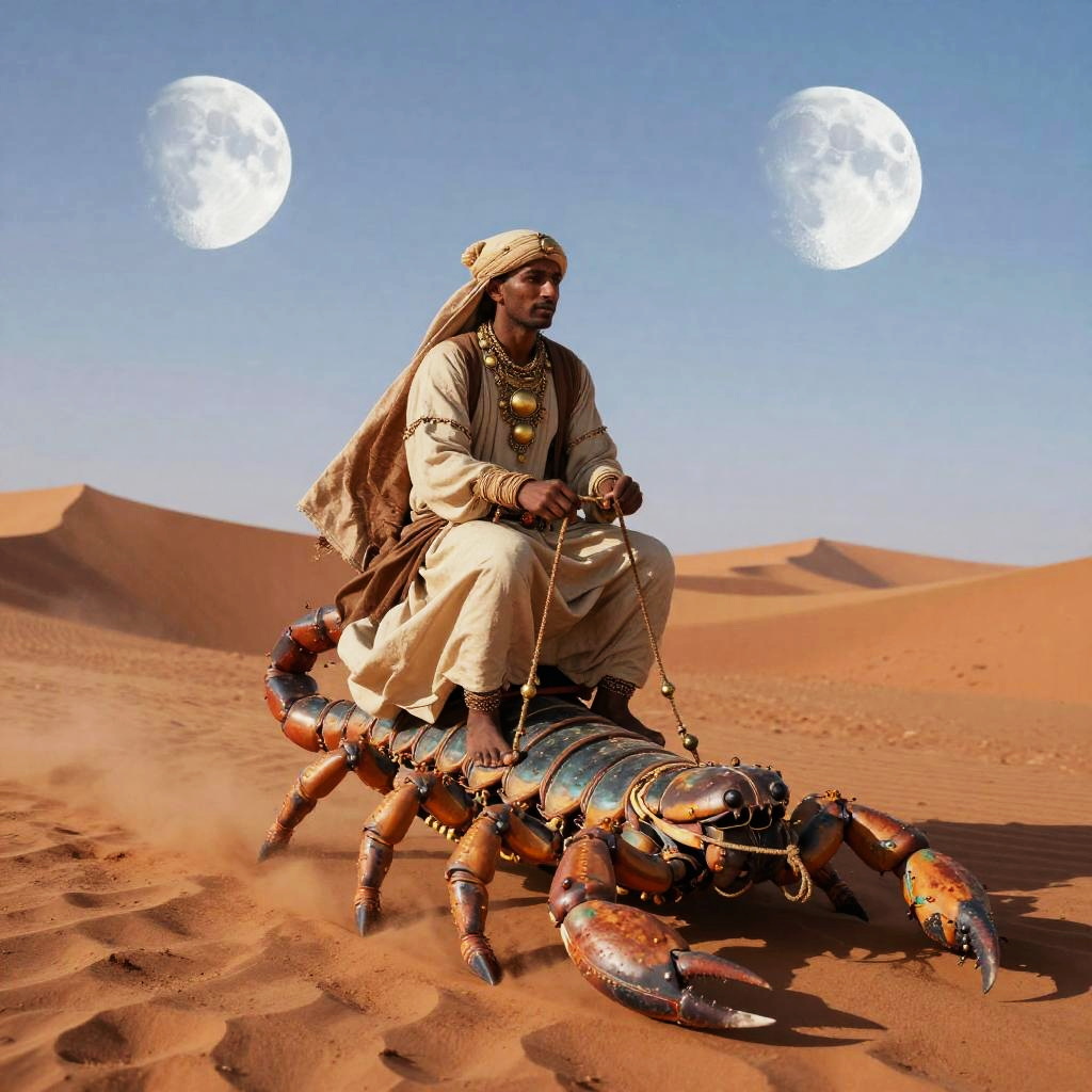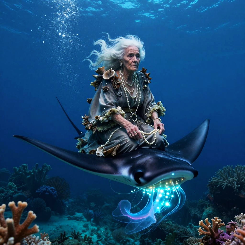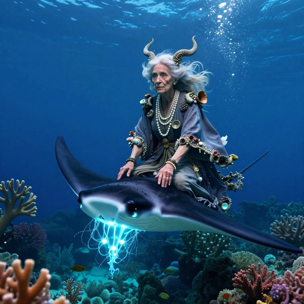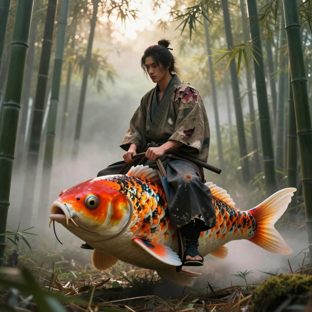 Photograph of an Asian man with messy black hair, wearing tattered dark robes, riding a large, colorful koi fish in a misty bamboo