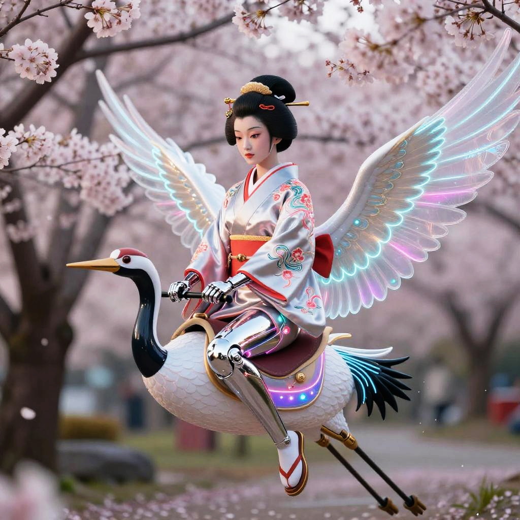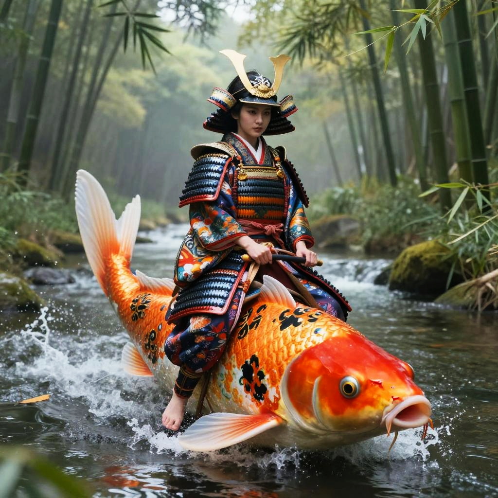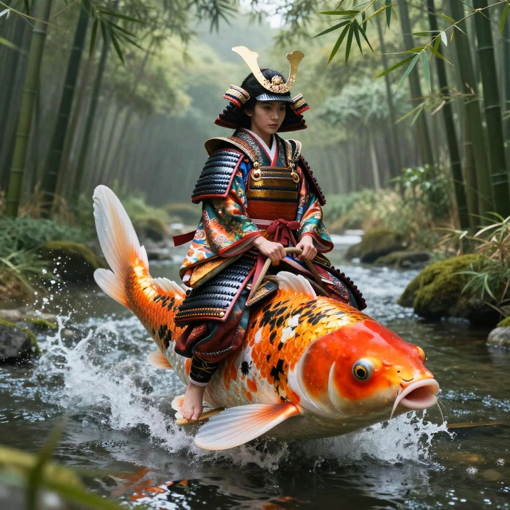 A stoic ronin wearing a worn kimono and hakama with battle scars while riding a giant koi-dragon. Set against a lush misty bamboo grove at dawn background, this scene captures ultra-realistic detail and dynamic lighting, all rendered in stunning 8k quality.