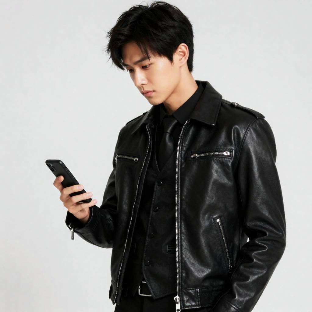 Cosplay Rogue Man, man in a leather jacket and leather vest holding a cell phone